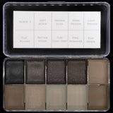 The palette contains Dark Brown and Light Brown from the Hair Illustrator Scalp Palette and Rotten Stone from the Grudge Palette. It also features seven new colors: Black 2 Soft Black, Brown Soot, Flat Blond, Flat Light Grey, Pink Remover and Flat Mixer. Use it alone or mix the colors with any of the other Skin Illustrator or Hair Illustrator tone to create your own unique blend of hair color. Also Available in a On Set Size.