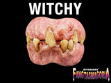 Witchy theatrical teeth from Bitemares Fangtasmagoria are designed to evoke disgust and unease. Creating a realistic portrayal of severe dental decay, neglect, and potential disease. The discolored, misshapen teeth and the unhealthy-looking gum line combine to create a truly grotesque and memorable effect. A look perfect for characters meant to be repulsive or afflicted.
